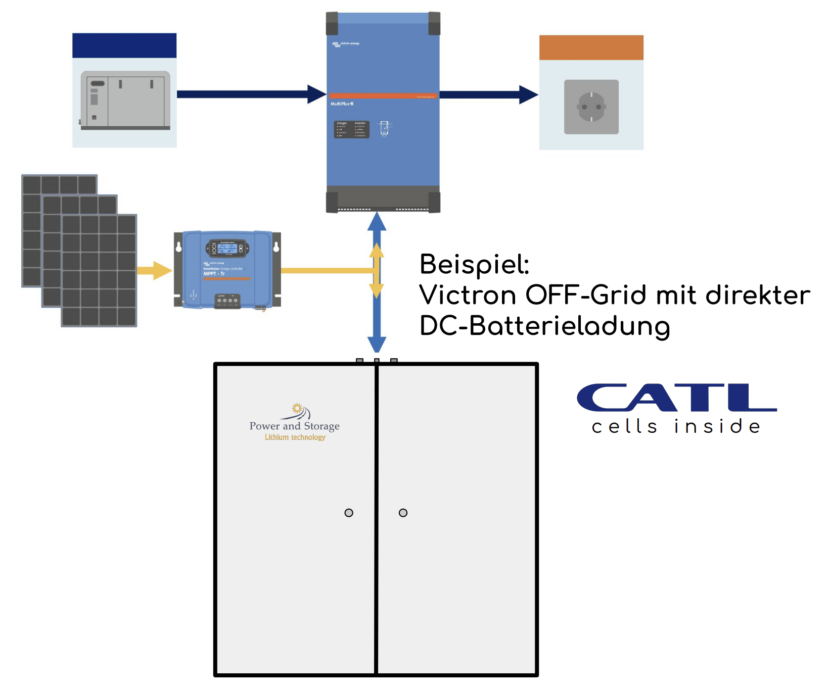 Es wird keine überschüssige Energie eingespeist, solange die Batterie nicht vollständig geladen ist, bzw. soweit die Leistung der Solarerzeugung die der Batteriewechselrichter nicht übersteigt.